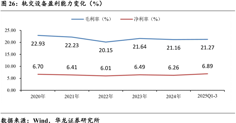 2025 年前三季度,轨交设备行业毛利率21.27%,净利率6.89%,较 2024年有所改善。单三季度实现毛利率20.79%,同比-0.17pct,环比-0.42pct; 实现净利率6.08%,同比-0.55pct,环比-1.57pct。
