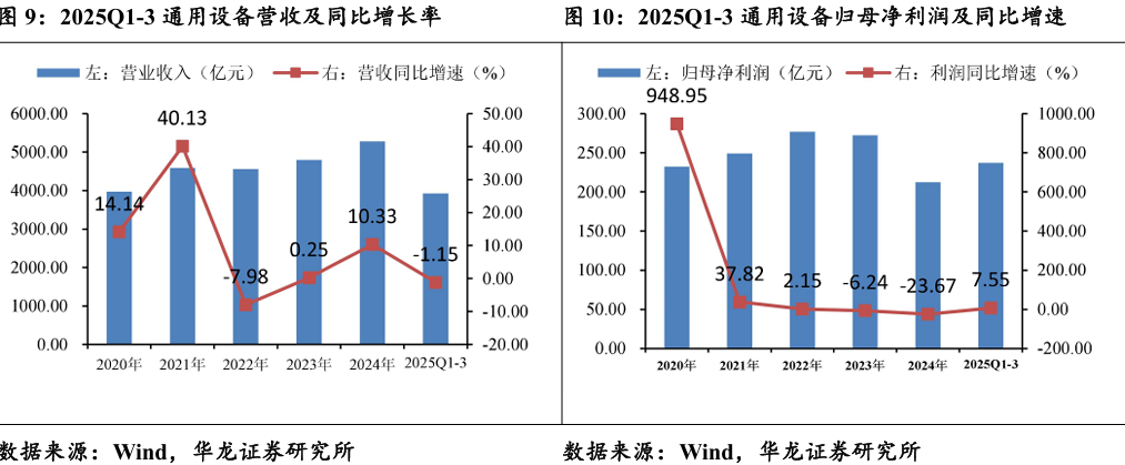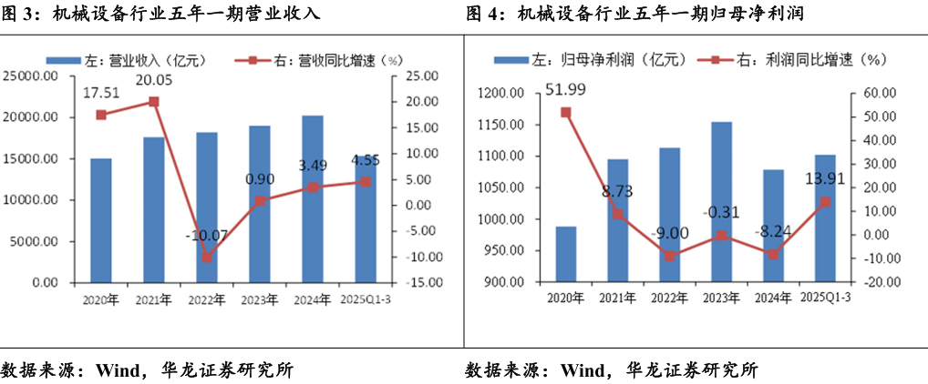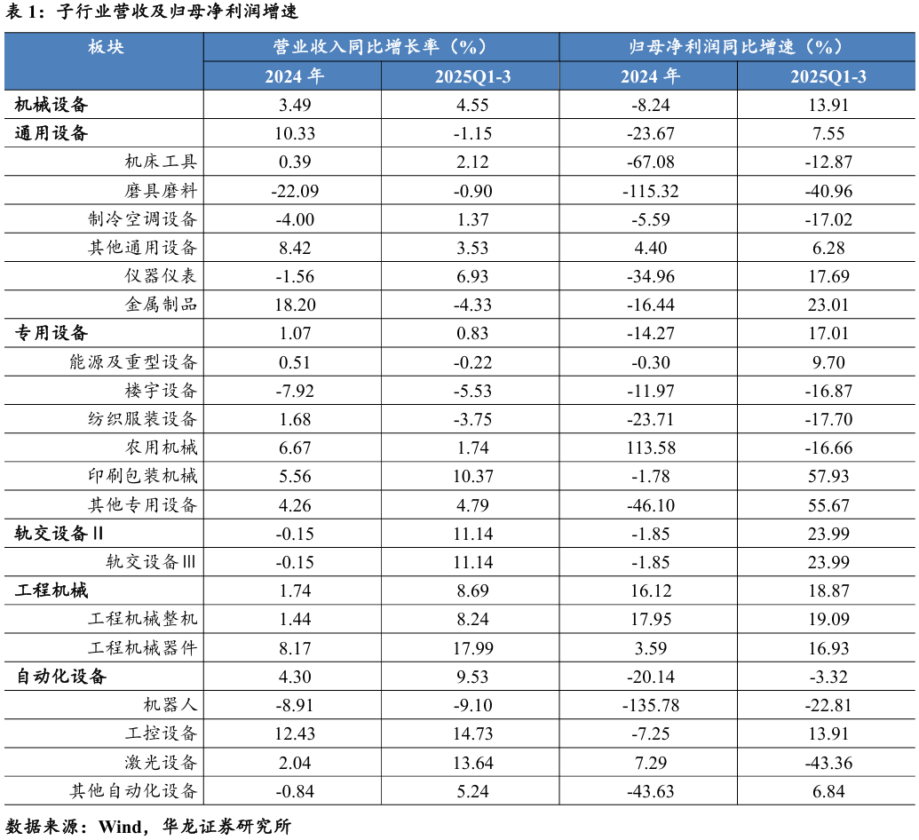 整体需求稳中有增,盈利质量明显改善。机械设备行业2025年 前三季度共实现营业收入15326.39亿元,同比+4.55%,实现归母净利润1101.92亿元,同比+13.91%。营业收入温和增长,需求端稳中有升,归母净利润显著改善,行业盈利有所修复,成本控制见效。
