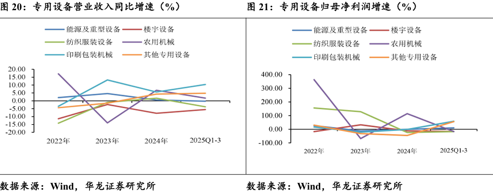 营收端:印刷包装设备及其他专用设备表现较好,楼宇及纺服设备收 入下滑。2025年前三季度专用设备营业收入增速由高到低分别为印刷包装 机械(+10.37%)、其他专用设备(+4.79%)、农用机械(+1.74%)、能源及 重型机械(-0.22%)、纺织服装设备(-3.75%)、楼宇设备(-5.53%)。