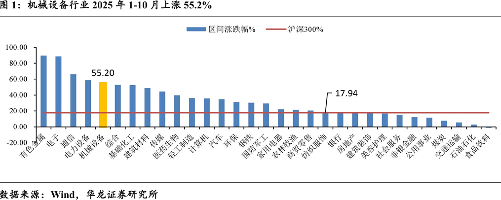 2025年年初至今(2025年10月31日),机械设备行业上涨55.2%, 同期沪深300指数上涨17.94%,相对收益37.27%,在一级31个行业中排名第5位。