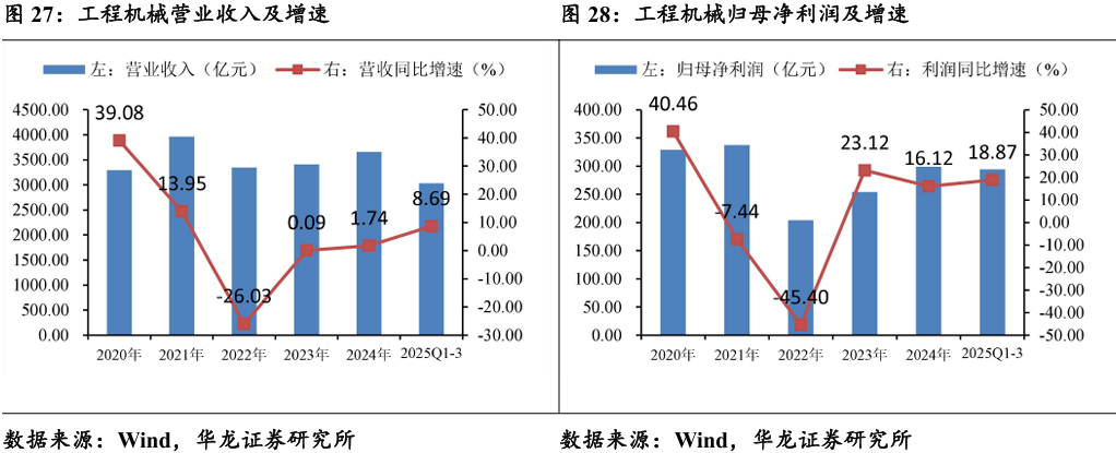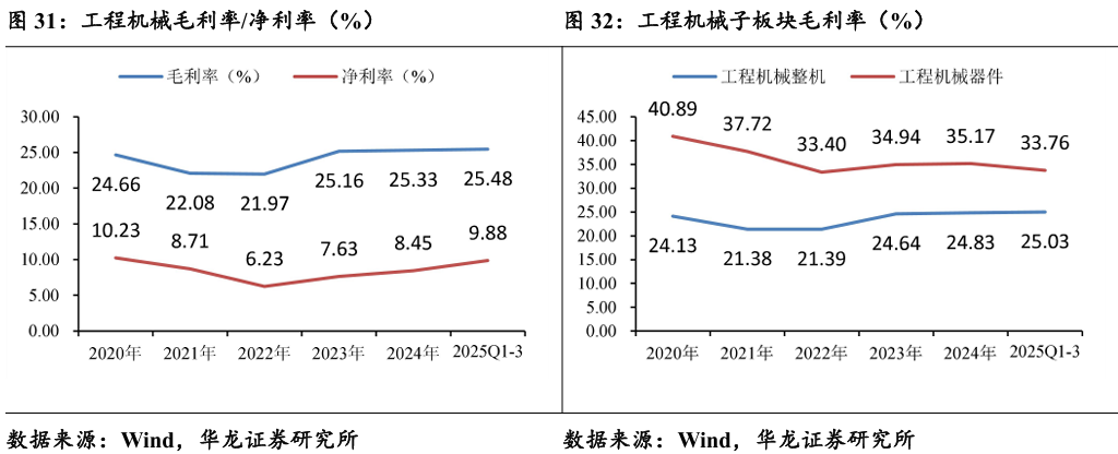 2025年前三季度,工程机械行业整体毛利率25.48%,净利率9.88%, 较2024年全年有所改善,我国工程机械行业处于复苏通道。
