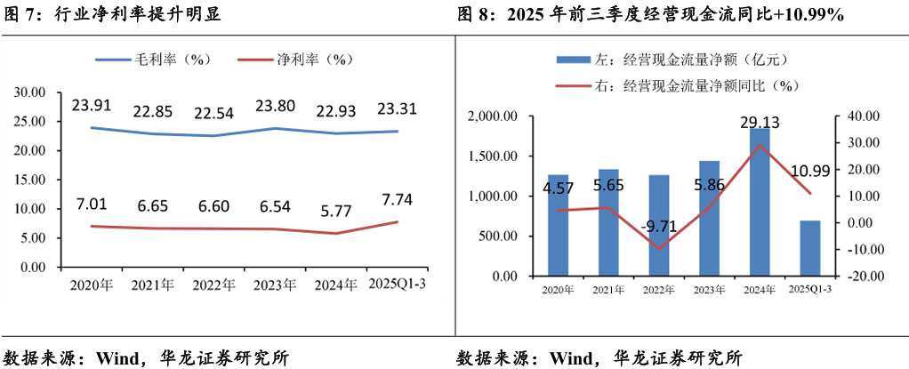 2025年前三季度行业整体毛利率为23.31%,净利率为7.74%,行业盈 利能力有所改善,净利率提升明显。我们认为,在营收增速温和的背景下, 净利率的提升并非来自市场需求的强力拉动,而是企业向内挖掘潜力的结 果,包括成本管控、费用优化以及产品结构升级等。