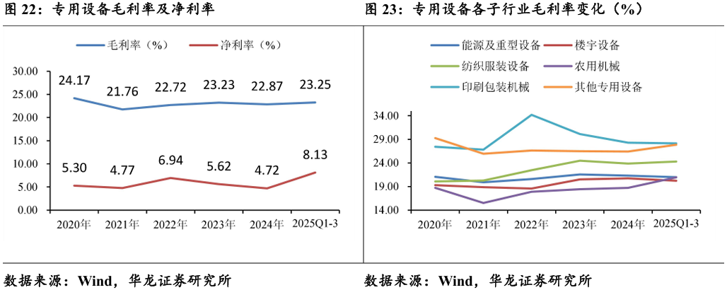 2025年前三季度专用设备毛利率为23.25%,较2024年有所改善;净 利率为8.13%,创近六年新高,提升幅度大于毛利率提升幅度。