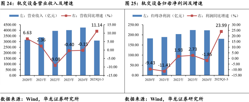 轨交设备2025年前三季度实现营业收入3092.2亿元,同比+11.14%; 实现归母净利润180.49亿元,同比+23.99%。轨交设备经过多年发展,目前形成了较为稳定的竞争格局,中国中车占据较大市场份额,贡献一半以上的收入。