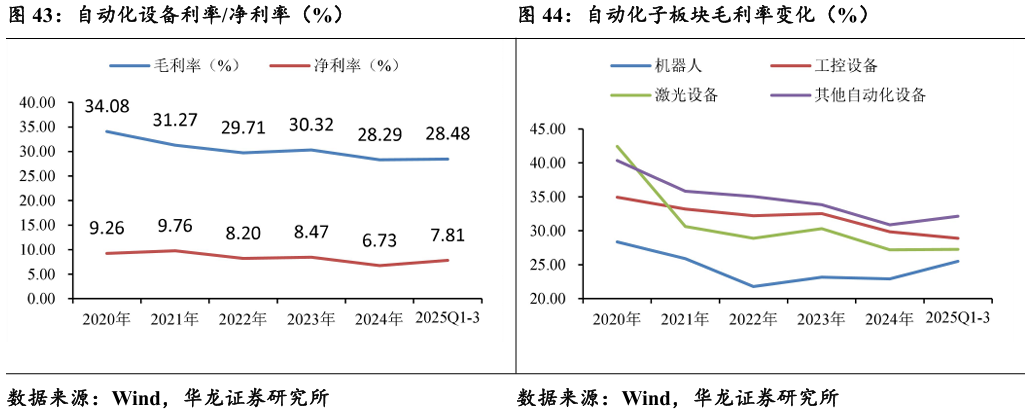 2025年前三季度,自动化行业整体实现毛利率28.48%,自2020年以 来处于下降趋势。行业整体盈利空间压缩,市场竞争加剧。净利率7.81%, 在2024年触底后反弹,企业营运效率提升,盈利质量改产具备可持续性。