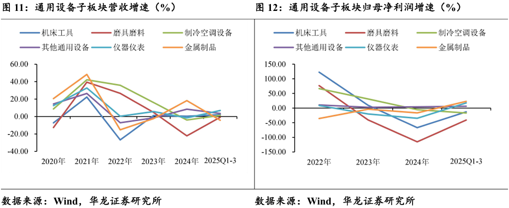 营收端:营收下降主要是受金属制品及磨具磨料影响,其他板块营收 均录得上涨。2025年前三季度通用设备子板块营收增速由高到低分别为仪 器仪表(+6.93%)、其他通用设备(+3.53%)、机床工具(+2.12%)、制冷 空调设备(+1.37%)、磨具磨料(-0.9%)、金属制品(-4.33%)。