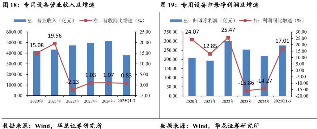 2025 年前三季度,专用设备实现营业收入共3802.95亿元,同比增长 0.83%;实现归母净利润276.31亿元,同比增长17.01%。子行业分化剧烈, 与消费、新兴产业相关的领域(印刷包装、其他专用)增长较快领域;房 地产、传统工业投资相关的领域(农机、楼宇设备)承压。