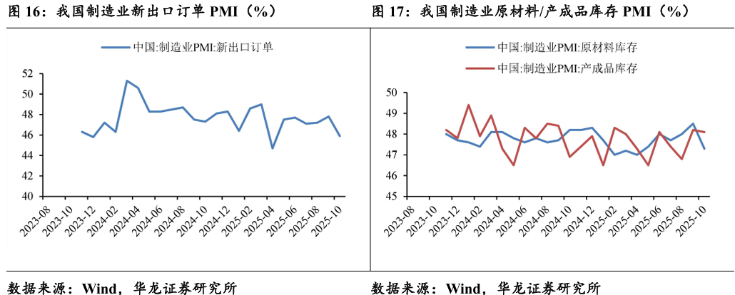2025 年 10 月新出口订单指数降至45.9%,为年内次低点,装备制造 业、高技术制造业和消费品制造业的出口均较上月明显收紧。