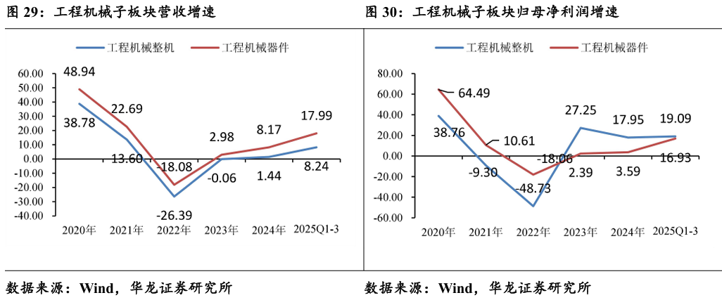 工程机械:海外盈利与内需复苏共振。2025年前三季度,工程机械共实现营业收入3032.49亿元,同比+8.69%;实现归母净利润 294.38 亿元,同比+18.87%。工程机械板块近期有所调整,主要是市场对短期挖机内销增速数据的过度反映。行业目前处于国内周期底部复苏与海外持续性高景气双重驱动的起点,短期回调提供中长期布局良机。