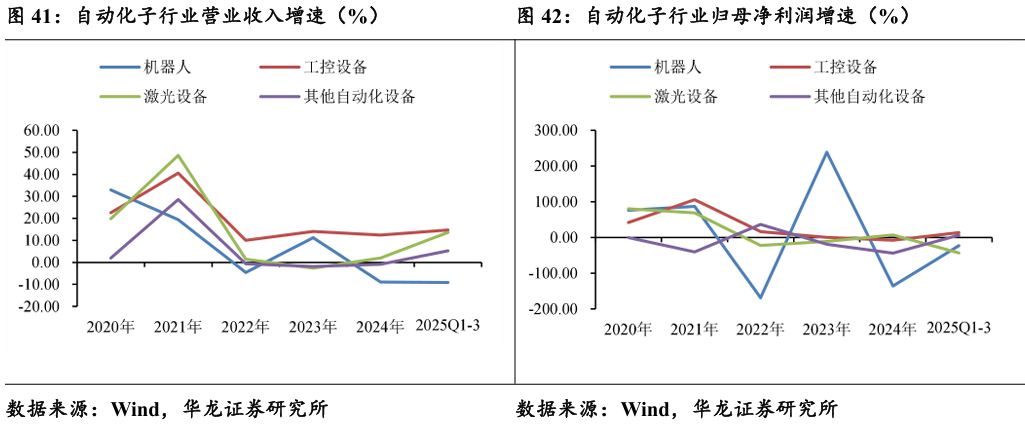 (5)自动化设备:营收稳健增长,但利润承压,内部分化严重。机器 人与激光设备仍处于调整期,但长期趋势向好;工控设备受益于工业智能化与新能源资本开支,利润增长较快。建议优选工控设备及下游结构性景气的部分激光设备标的。