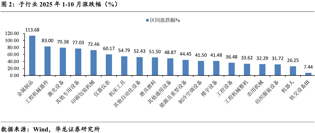 子行业涨幅前五分别为:金属制品(+113.68%)、工程机械器件(+83%)、 激光设备(+79.38%)、其他专用设备(+77.03%)、印刷包装机械(+72.46%); 子行业涨幅后五分别为:轨交设备(+7.44%)、机器人(+26.25%)、纺织服装设备(+31.72%)、农用机械(+32.29%)、工程机械整机(+33.62%)。