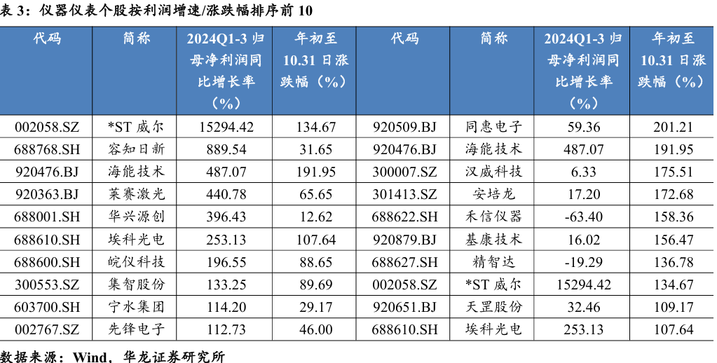 仪器仪表量利齐升,营收增长带动规模效应,同时其高技术壁垒带来了较高的定价权和利润率,利润增速远超营收增速。仪器仪表利润增速 (+17.69%)较高,主要受益于*ST威尔(002058.SZ)、容知日新(688768.SH)、海能技术(920476.BJ)、莱赛激光(920363.BJ)、华兴源创(688001.SH) 等公司业绩改善。前三季度涨幅居前的个股多为人形机器人、存储设备、 量子科技等概念。