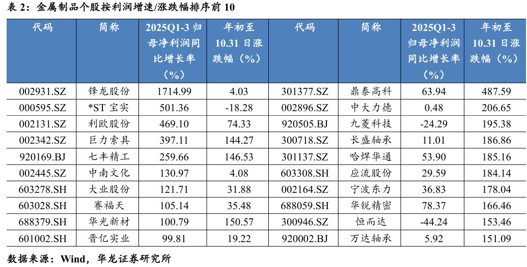 金属制品中原材料成本占比较大,受益于成本红利(钢材价格低位) 盈利改善明显,后续需继续观察需求回暖时点。金属制品利润增速 (+23.01%)较高,主要受益于锋龙股份(+1714.99%)、*ST宝实(+501.36%)、利欧股份(+469.1%)、巨力索具(+397.11%)、七丰精工(+259.66%)等个股 业绩改善。前三季度涨幅居前的多为PCB钻针、人形机器人、可控核聚变等概念。