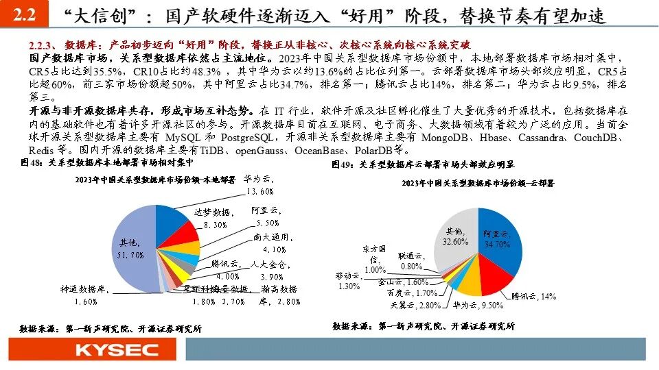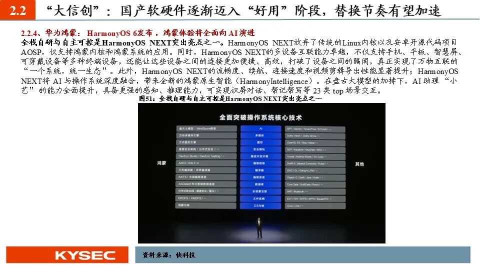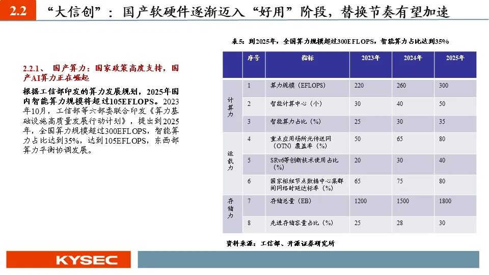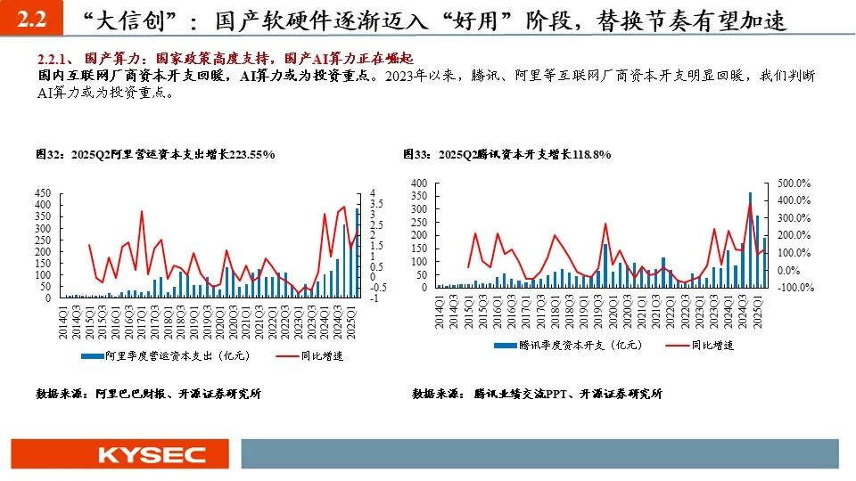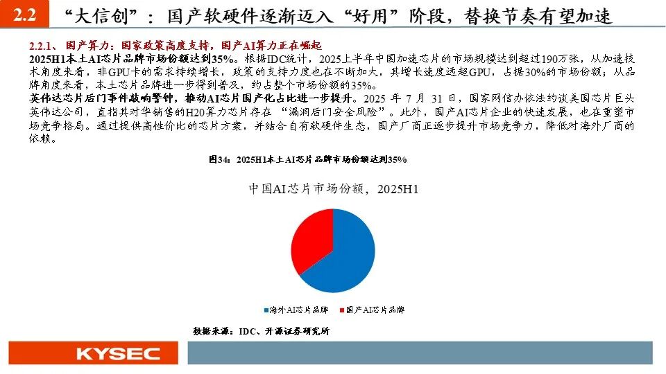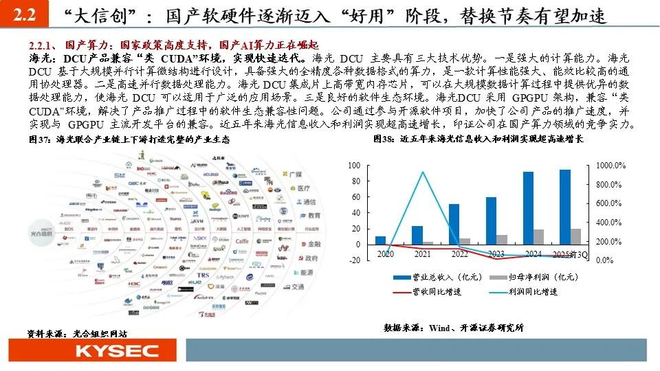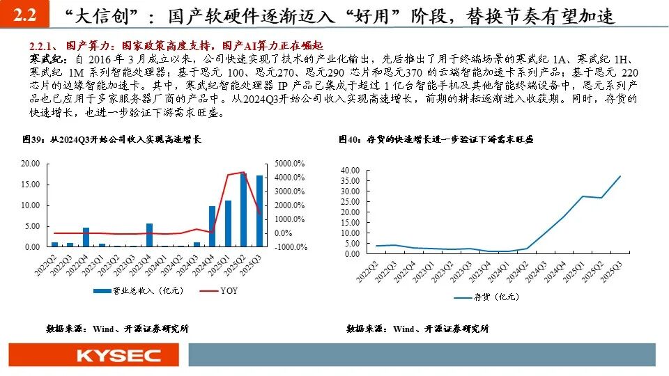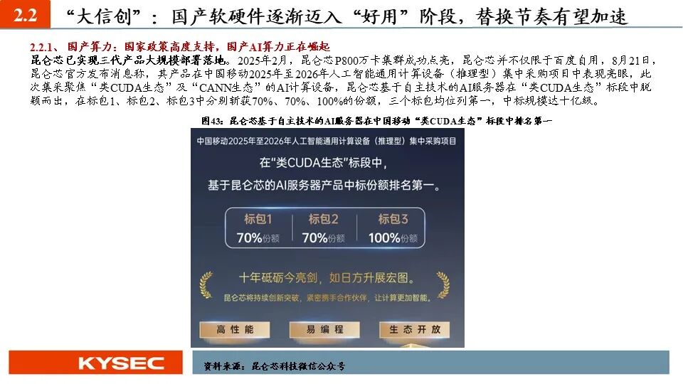 (2)“大信创”:国产软硬件逐渐迈入“好用”阶段,替换节奏有望加速。在国家鼓励科技自立自强的政策推动下,国产算力、操作系统、数据库等领域迎来黄金发展期。特别是在全球AI军备竞赛背景下,以寒武纪、海光信息、昆仑芯为代表的国产AI芯片快速崛起,重塑市场竞争格局。
