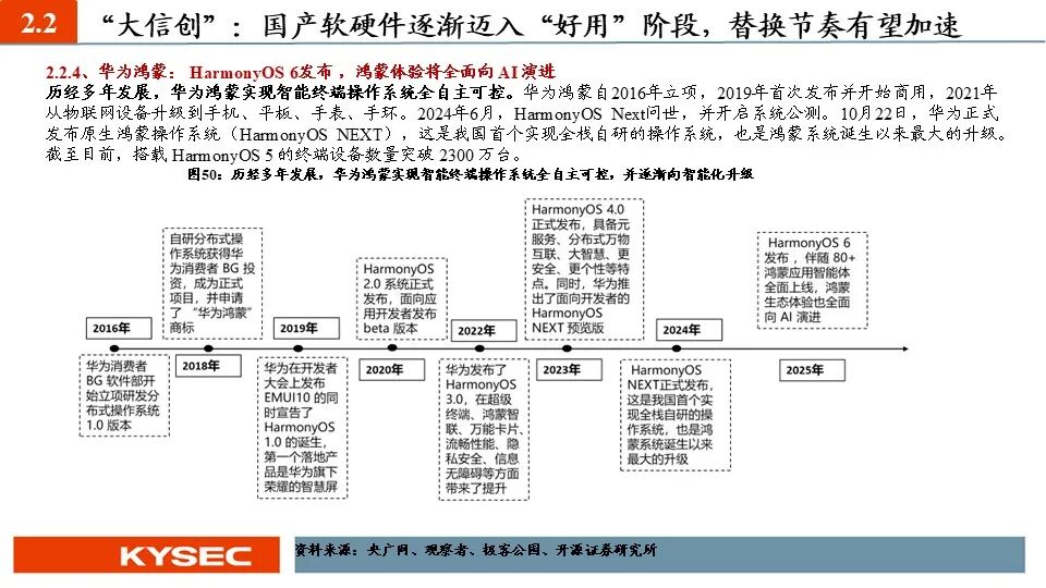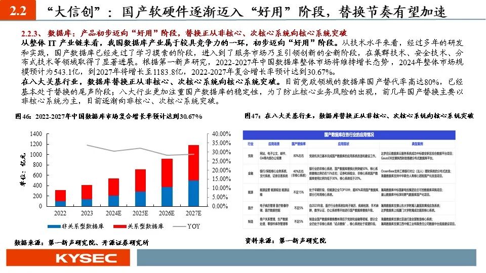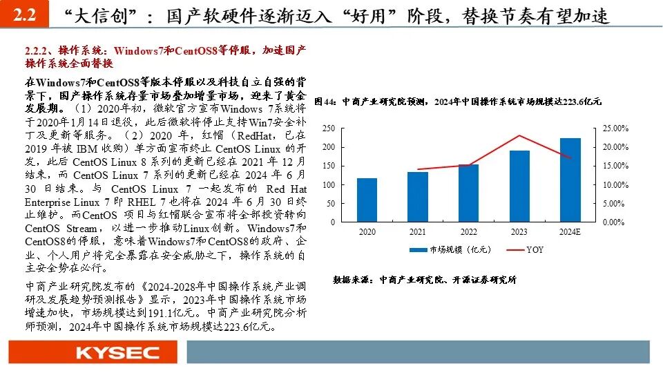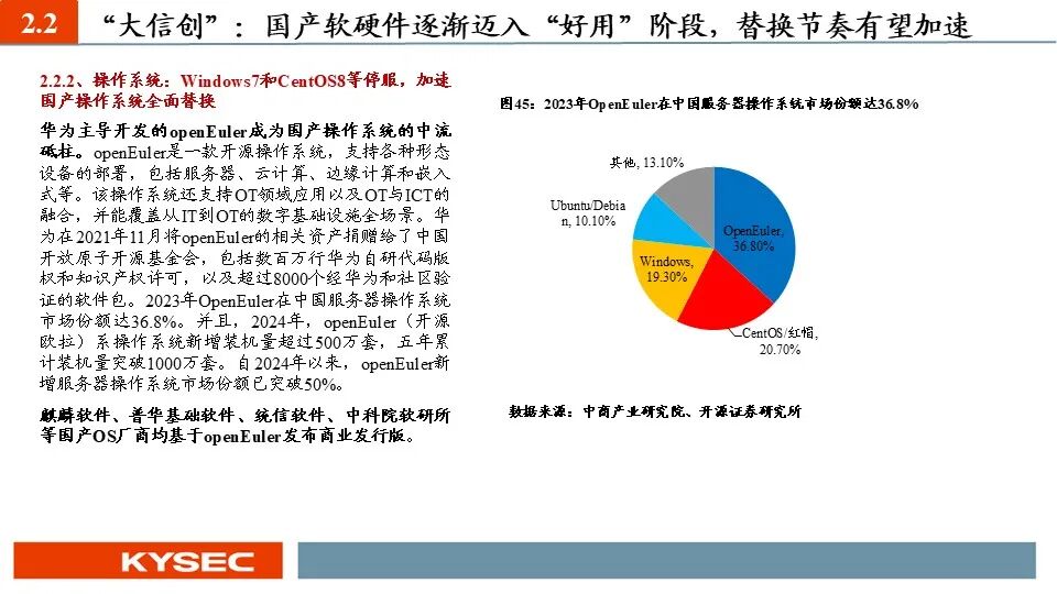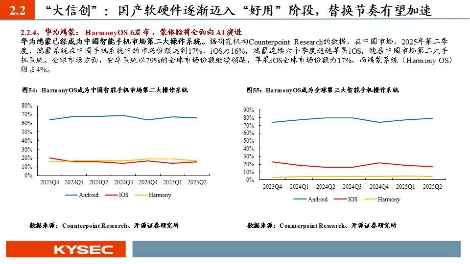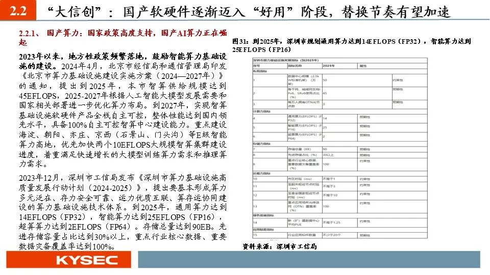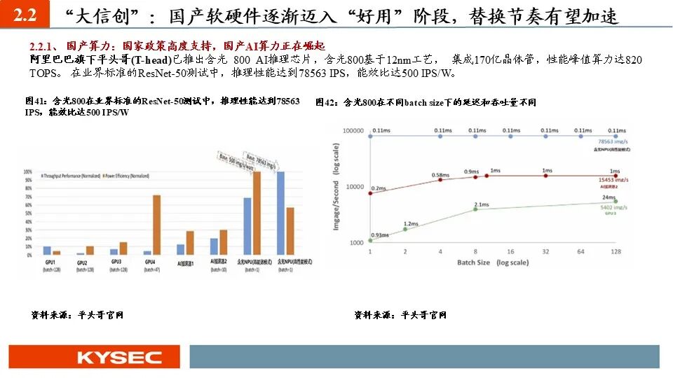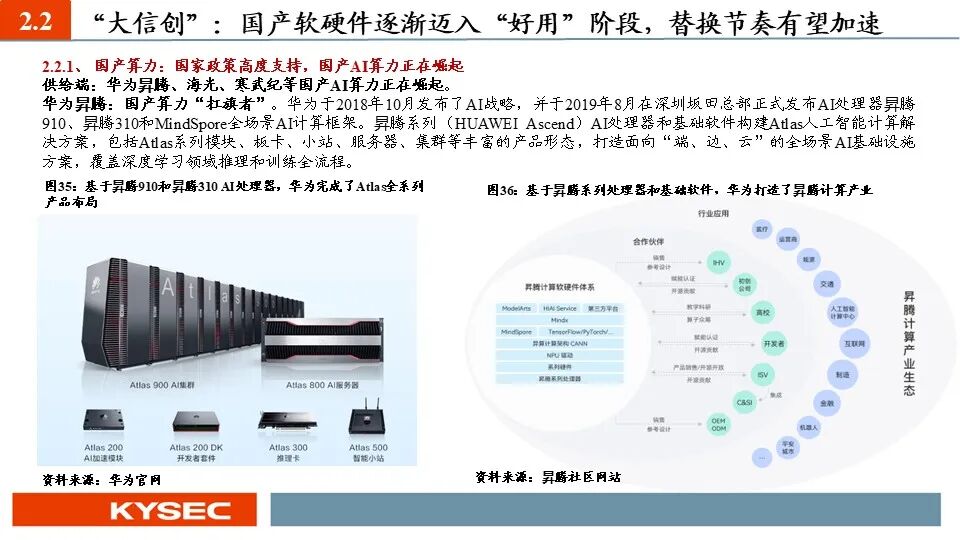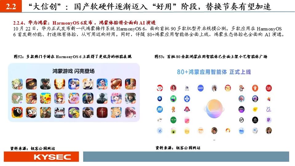 (2)“大信创”:国产软硬件逐渐迈入“好用”阶段,替换节奏有望加速。在国家鼓励科技自立自强的政策推动下,国产算力、操作系统、数据库等领域迎来黄金发展期。特别是在全球AI军备竞赛背景下,以寒武纪、海光信息、昆仑芯为代表的国产AI芯片快速崛起,重塑市场竞争格局。