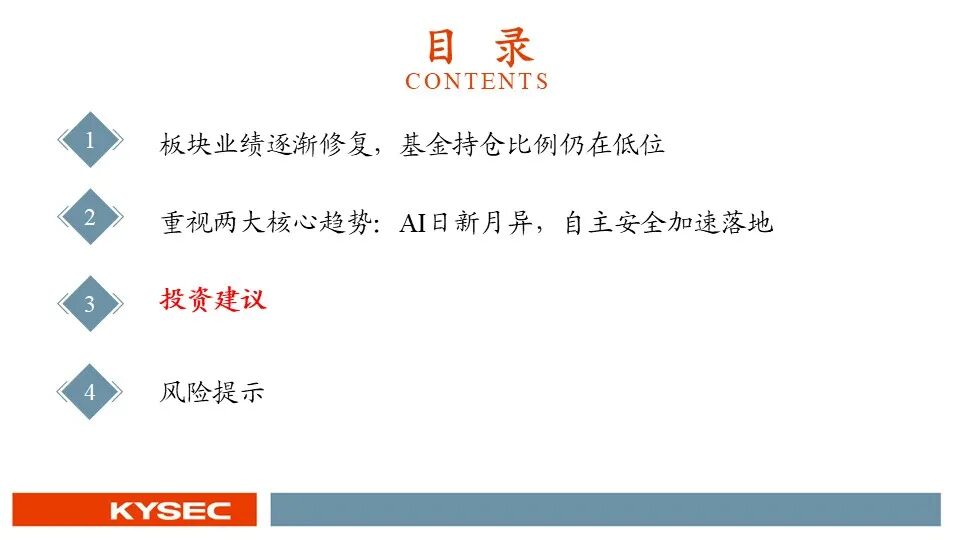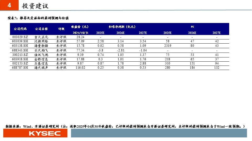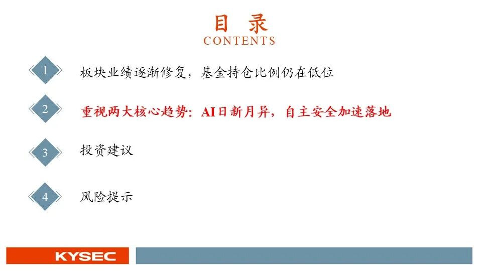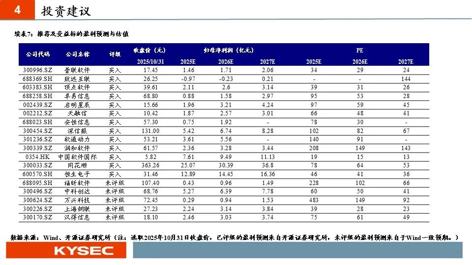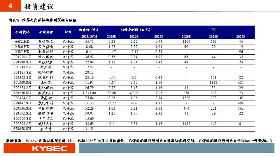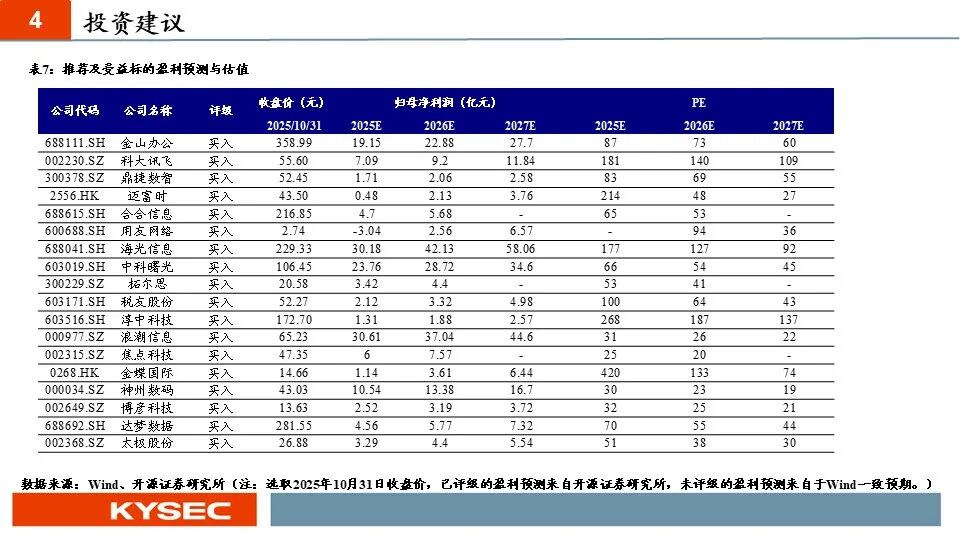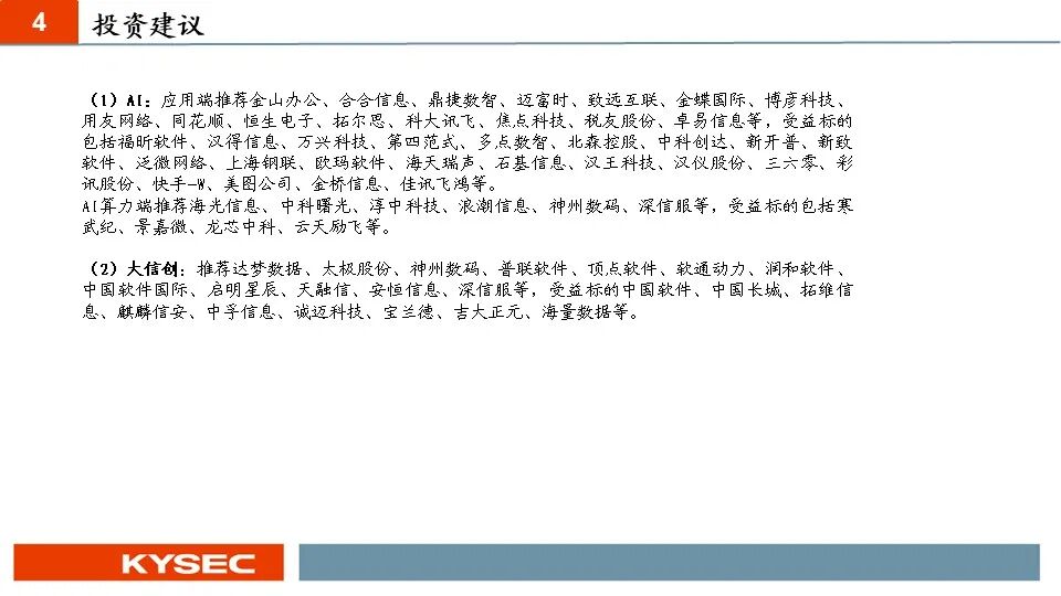 (1)AI:应用端推荐金山办公、合合信息、鼎捷数智、迈富时、致远互联、金蝶国际、博彦科技、用友网络、同花顺、恒生电子、拓尔思、科大讯飞、焦点科技、税友股份、卓易信息等,受益标的包括福昕软件、汉得信息、万兴科技、第四范式、多点数智、北森控股、中科创达、新开普、新致软件、泛微网络、上海钢联、欧玛软件、海天瑞声、石基信息、汉王科技、汉仪股份、三六零、彩讯股份、快手-W、美图公司、金桥信息、佳讯飞鸿等。AI算力端推荐海光信息、中科曙光、淳中科技、浪潮信息、神州数码、深信服等,受益标的包括寒武纪、景嘉微、龙芯中科、云天励飞等。(2)大信创:推荐达梦数据、太极股份、神州数码、普联软件、顶点软件、软通动力、润和软件、中国软件国际、卓易信息、启明星辰、天融信、安恒信息、深信服等,受益标的中国软件、中国长城、拓维信息、麒麟信安、中孚信息、诚迈科技、宝兰德、吉大正元、海量数据等。