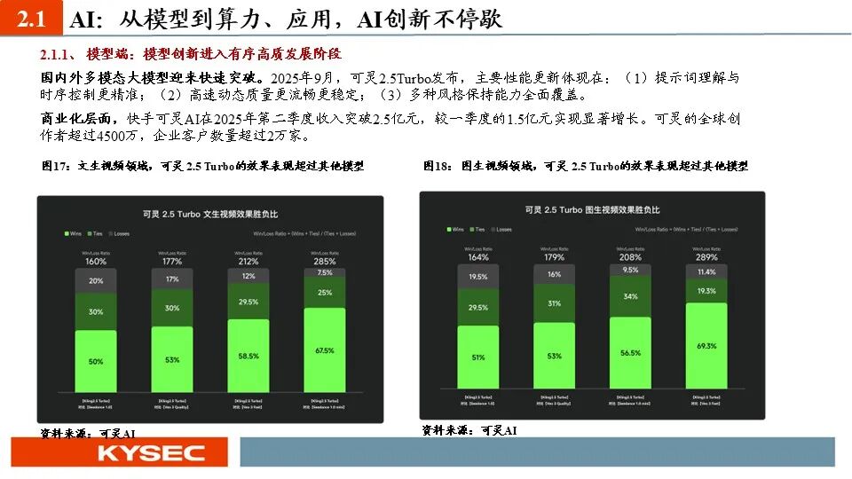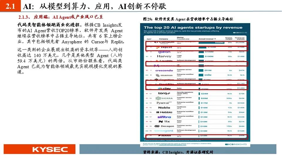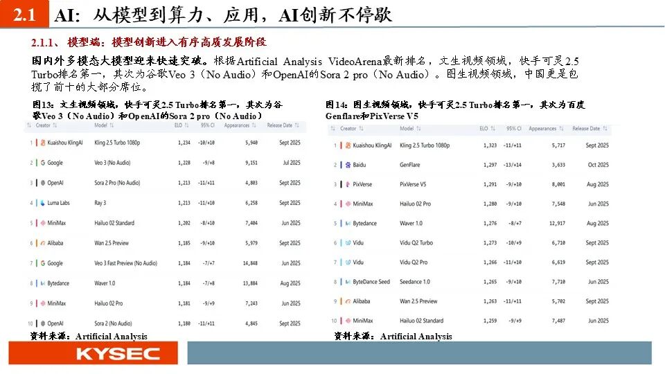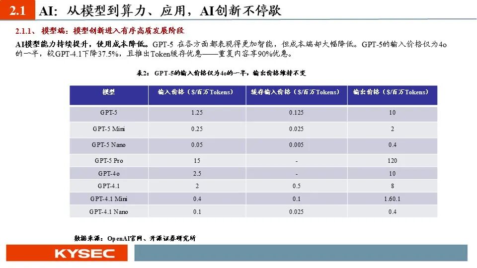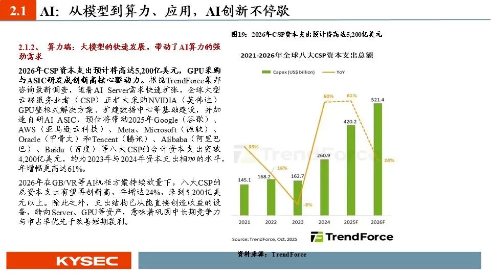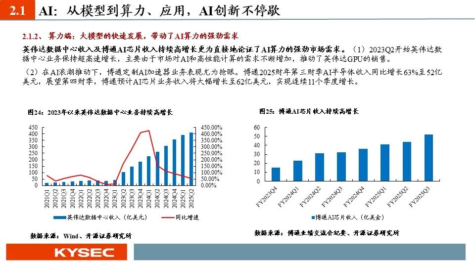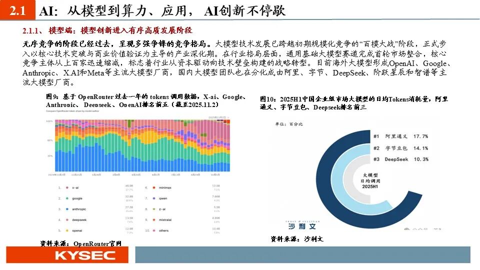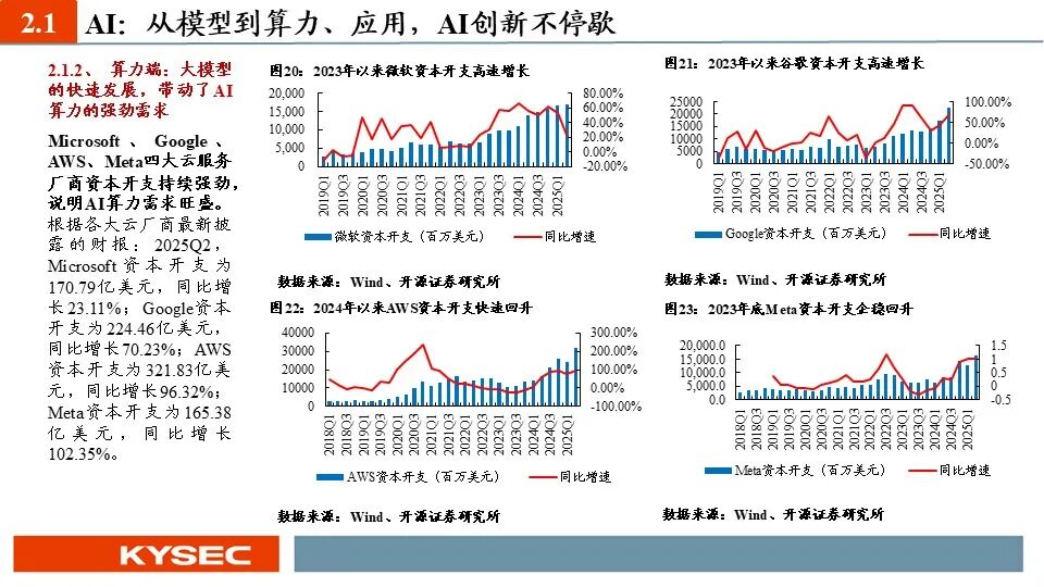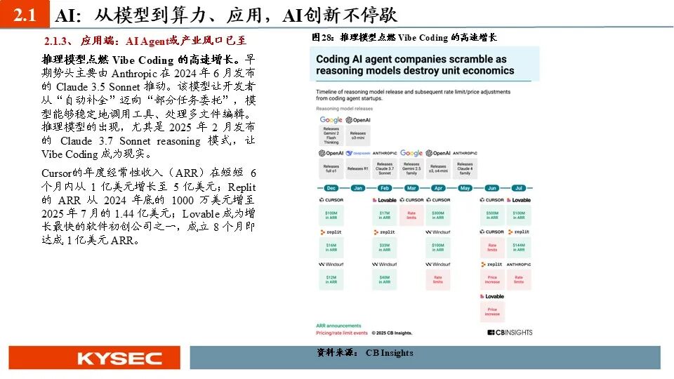 (1)从模型到算力、应用,AI创新不停歇。模型端:模型创新进入有序高质发展阶段,AI模型能力持续提升,使用成本降低,以Deepseek、Qwen为代表的中国开源模型崛起,被世界“看见”。同时,多模态大模型迎来快速突破,有望推动应用端的进一步繁荣。算力端:全球CSP资本开支增长强劲,英伟达、博通AI芯片业务持续高增长,OpenAI大幅提升未来几年的算力支出规划,论证了AI算力需求持续旺盛。应用端:2025年是AI Agent商业化元年,代码类Agent领跑商业化进程。