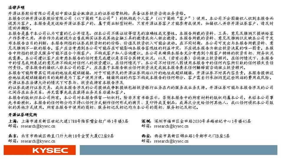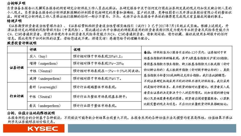 《证券期货投资者适当性管理办法》于2017年7月1日起正式实施。通过微信形式制作的本资料仅面向开源证券客户中的金融机构专业投资者,请勿对本资料进行任何形式的转发行为。若您并非开源证券客户中的金融机构专业投资者,为保证服务质量、控制投资风险,请勿订阅、接收或使用本订阅号中的信息。本资料难以设置访问权限,若给您造成不便,还请见谅!感谢您给予的理解和配合。若有任何疑问,请与我们联系。 开源证券股份有限公司是经中国证监会批准设立的证券经营机构,具备证券投资咨询业务资格。 本报告仅供开源证券股份有限公司(以下简称“本公司”)的客户使用。本公司不会因接收人收到本报告而视其为客户。本报告是发送给开源证券客户的,属于商业秘密材料,只有开源证券客户才能参考或使用,如接收人并非开源证券客户,请及时退回并删除。 本报告是基于本公司认为可靠的已公开信息,但本公司不保证该等信息的准确性或完整性。本报告所载的资料、工具、意见及推测只提供给客户作参考之用,并非作为或被视为出售或购买证券或其他金融工具的邀请或向人做出邀请。本报告所载的资料、意见及推测仅反映本公司于发布本报告当日的判断,本报告所指的证券或投资标的的价格、价值及投资收入可能会波动。在不同时期,本公司可发出与本报告所载资料、意见及推测不一致的报告。客户应当考虑到本公司可能存在可能影响本报告客观性的利益冲突,不应视本报告为做出投资决策的唯一因素。本报告中所指的投资及服务可能不适合个别客户,不构成客户私人咨询建议。本公司未确保本报告充分考虑到个别客户特殊的投资目标、财务状况或需要。本公司建议客户应考虑本报告的任何意见或建议是否符合其特定状况,以及(若有必要)咨询独立投资顾问。在任何情况下,本报告中的信息或所表述的意见并不构成对任何人的投资建议。在任何情况下,本公司不对任何人因使用本报告中的任何内容所引致的任何损失负任何责任。若本报告的接收人非本公司的客户,应在基于本报告做出任何投资决定或就本报告要求任何解释前咨询独立投资顾问。 本报告可能附带其它网站的地址或超级链接,对于可能涉及的开源证券网站以外的地址或超级链接,开源证券不对其内容负责。本报告提供这些地址或超级链接的目的纯粹是为了客户使用方便,链接网站的内容不构成本报告的任何部分,客户需自行承担浏览这些网站的费用或风险。 开源证券在法律允许的情况下可参与、投资或持有本报告涉及的证券或进行证券交易,或向本报告涉及的公司提供或争取提供包括投资银行业务在内的服务或业务支持。开源证券可能与本报告涉及的公司之间存在业务关系,并无需事先或在获得业务关系后通知客户。 本报告的版权归本公司所有。本公司对本报告保留一切权利。除非另有书面显示,否则本报告中的所有材料的版权均属本公司。未经本公司事先书面授权,本报告的任何部分均不得以任何方式制作任何形式的拷贝、复印件或复制品,或再次分发给任何其他人,或以任何侵犯本公司版权的其他方式使用。所有本报告中使用的商标、服务标记及标记均为本公司的商标、服务标记及标记。 |