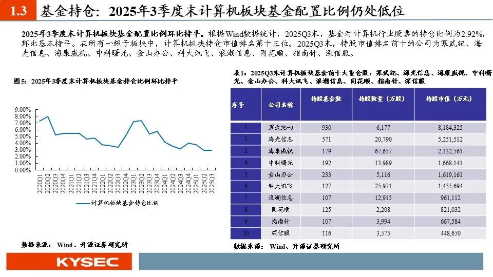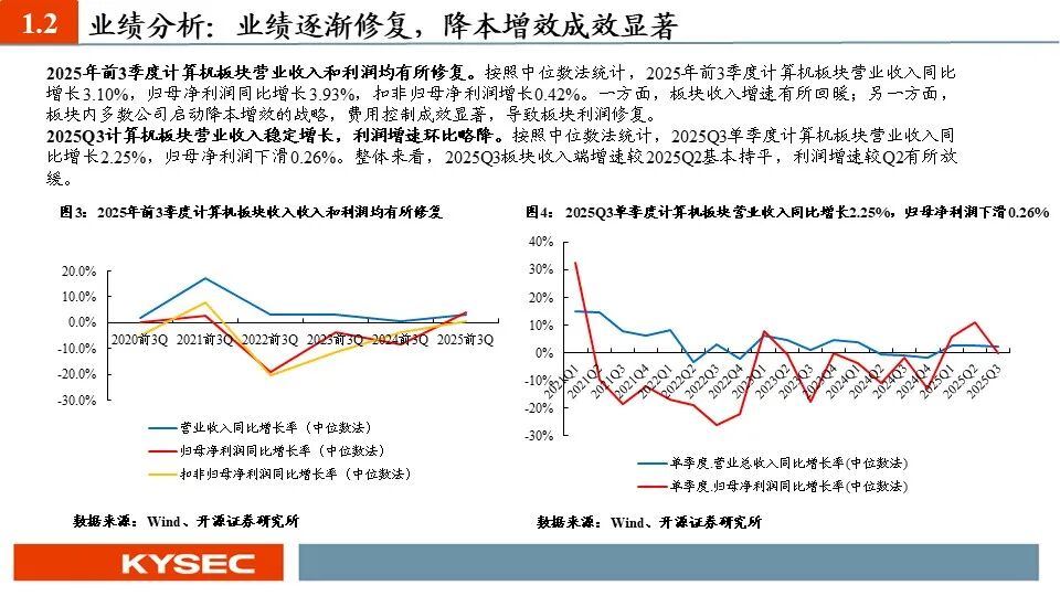 从板块表现来看,截至2025年10月31日收盘,计算机指数较年初上涨25.12%,在所有一级行业中排名第九。从基金持仓来看,截止2025年9月30日,基金对计算机行业股票的持仓比例为2.92%,环比基本持平,仍处于历史低位。从业绩端看,按照中位数法统计,2025年前3季度计算机板块营业收入同比增长3.10%,归母净利润同比增长3.93%,收入和利润均有所回暖。