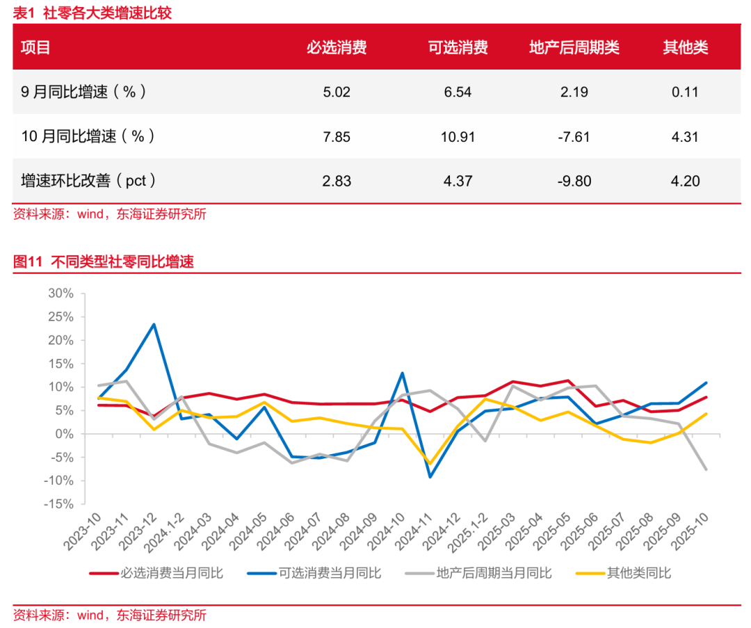 1)分商品及服务:餐饮增速环比改善,商品增速环比放缓。1>国庆中秋双节,带动餐饮增速环比改善。10月社零餐饮服务总额5199亿元,同比上涨3.8%,增速环比上升2.9pct。2>商品零售增速环比放缓。10月社零商品零售总额41092亿元,同比增长2.8%,增速环比下降0.5pct,主要受占比较大的汽车销售走弱影响。2)大类表现:可选、必选、其他类边际持续改善,地产后周期同比由正转负。10月必选、可选、地产后周期、其他类零售额同比分别为+7.85%、+10.91%、-7.61%、+4.31%,增速分别较上月环比+2.83pct、+4.37pct、-9.80pct、+4.20pct。