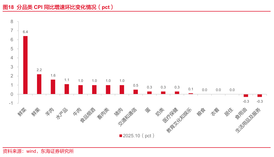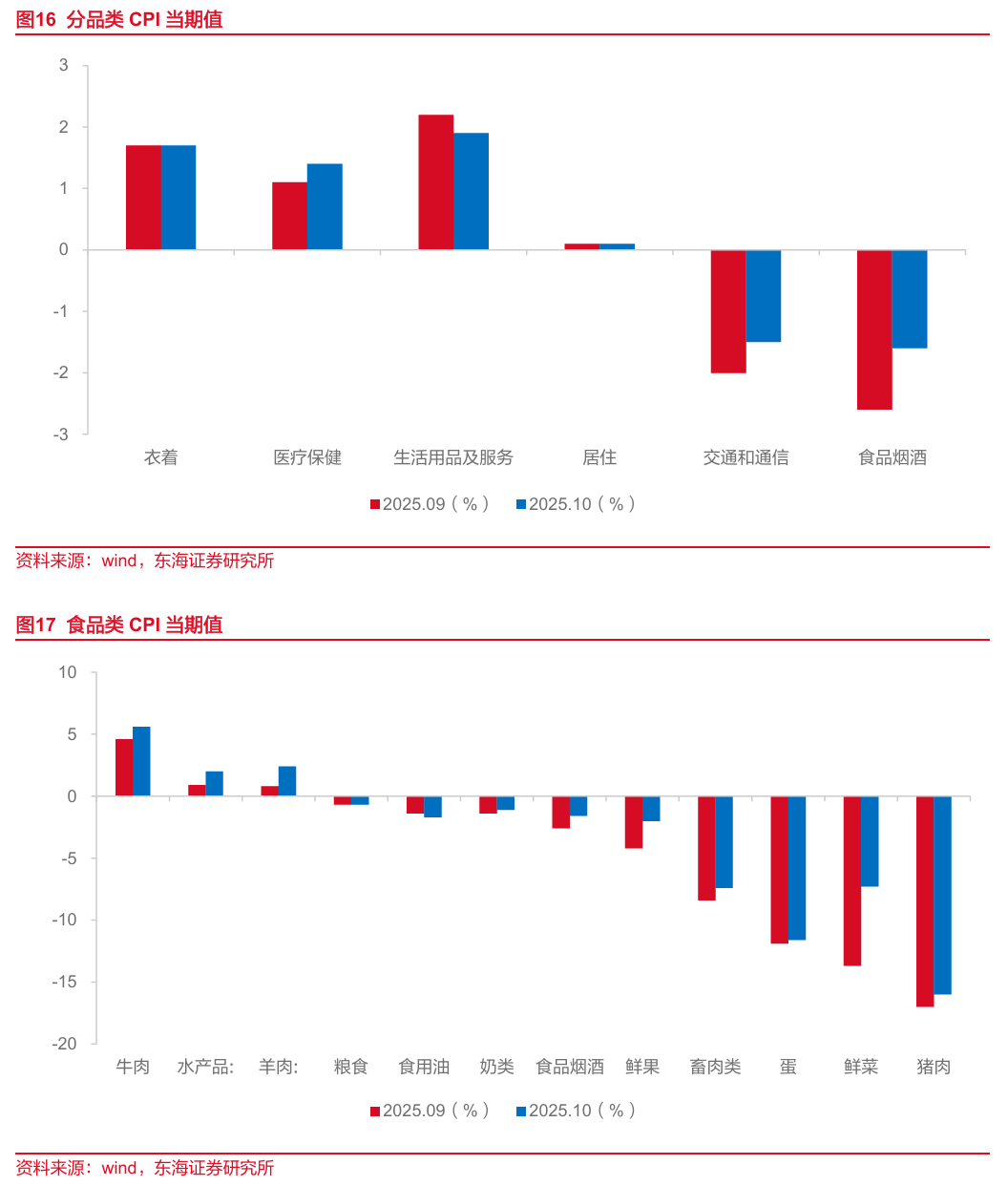 (2)分品类:食品类同比降幅收窄,非食品同比价格五涨一跌。1>食品类:10月食品类价格同比下降2.9%,环比+1.5pct,影响CPI同比下降约0.54个百分点,其中猪肉和蛋为主要拖累项,分别同比-16.0%、-11.6%。2>非食品类:10月教育文化和娱乐、衣着、医疗保健、生活用品及服务、居住和交通通信分别同比+0.9%(环比+0.1pct)、+1.7%(环比持平)、+1.4%(环比+0.3pct)、+1.9%(环比-0.3pct)、+0.1%(环比持平)和-1.5%(环比+0.5pct)。