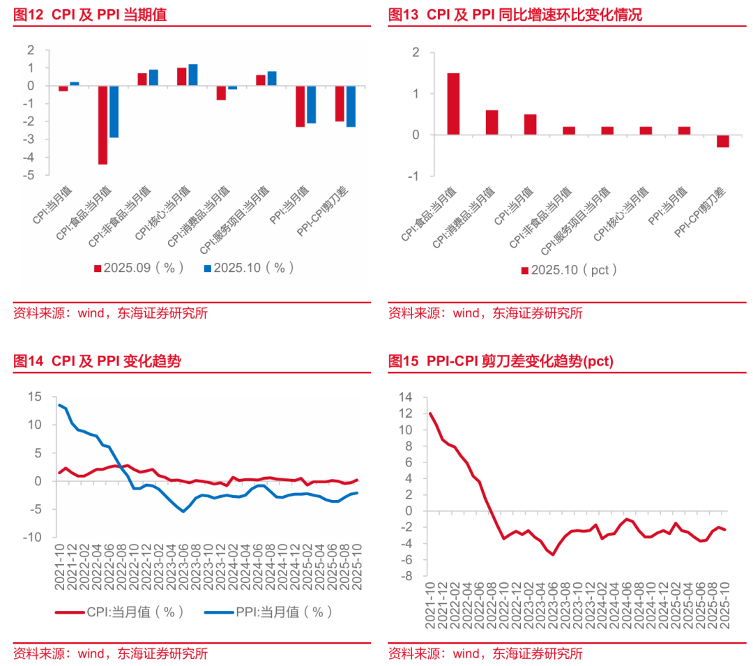 整体情况:CPI同比上升,PPI同比跌幅连续3个月收窄,PPI-CPI剪刀差扩大。1>10月CPI同比上升。2025年10月CPI同比上升0.2%(环比+0.5pct),去掉食品、能源的核心CPI同比上涨1.2%(环比+0.2pct),连续6个月涨幅扩大。2>食品与非食品环比均改善。食品、非食品CPI分别同比-2.9%(环比+1.5pct)、同比+0.9%(环比+0.2pct)。3>消费品价格同比下降、服务同比上升。消费品CPI同比-0.2%(环比+0.6pct),服务CPI同比+0.8%(环比+0.2pct)。4>PPI同比跌幅连续3个月收窄,PPI-CPI剪刀差扩大。10月PPI同比-2.1%(环比+0.2pct),跌幅连续3个月收窄,得益于国内部分行业供需关系改善,10月PPI-CPI剪刀差为-2.3%(环比-0.3pct)。