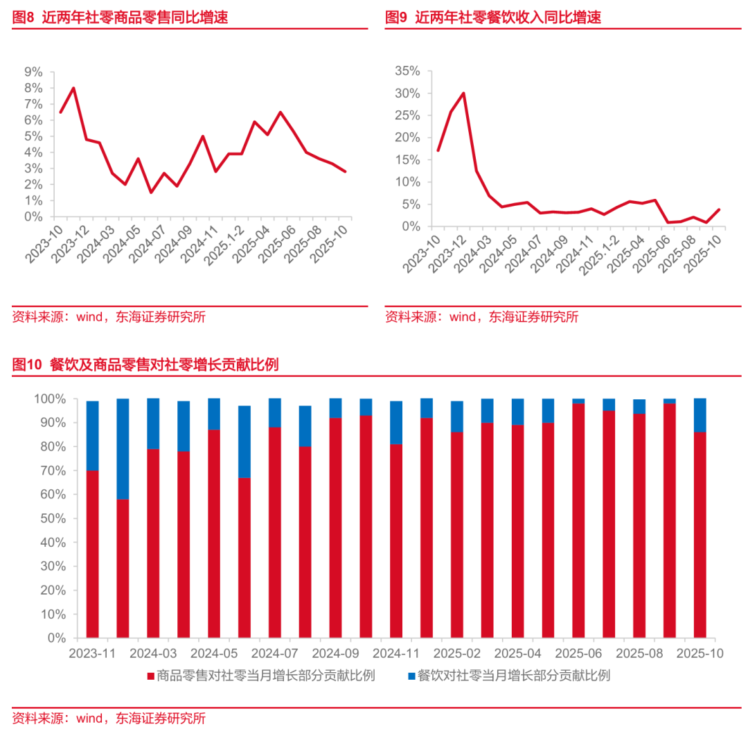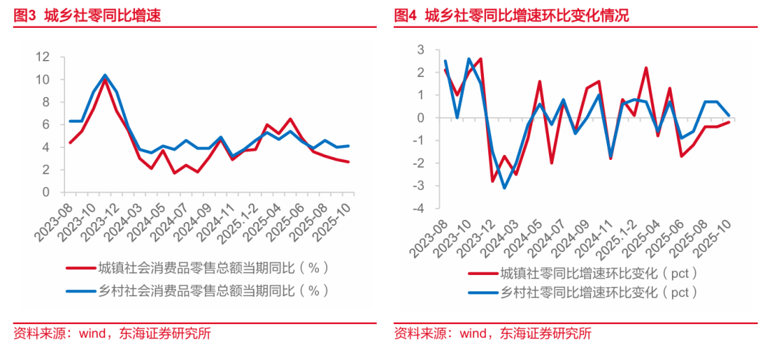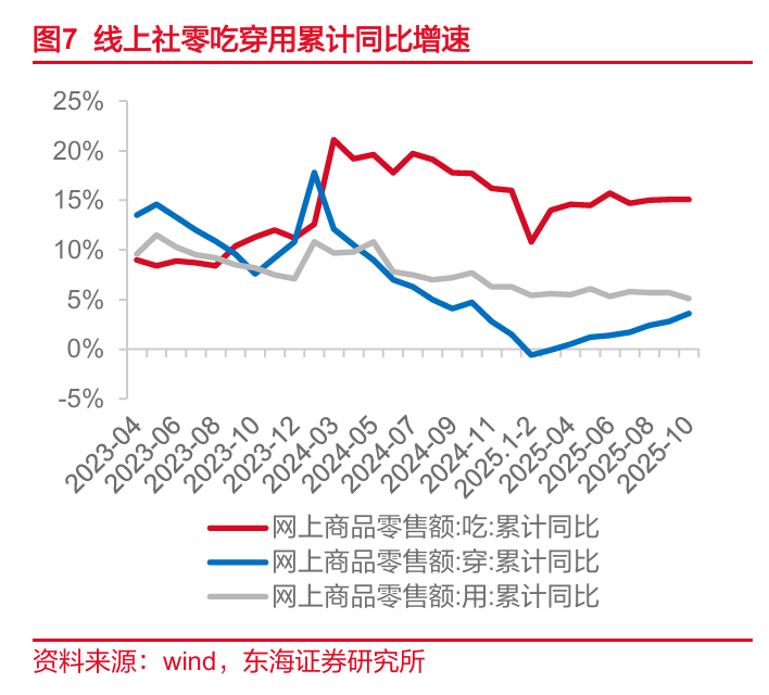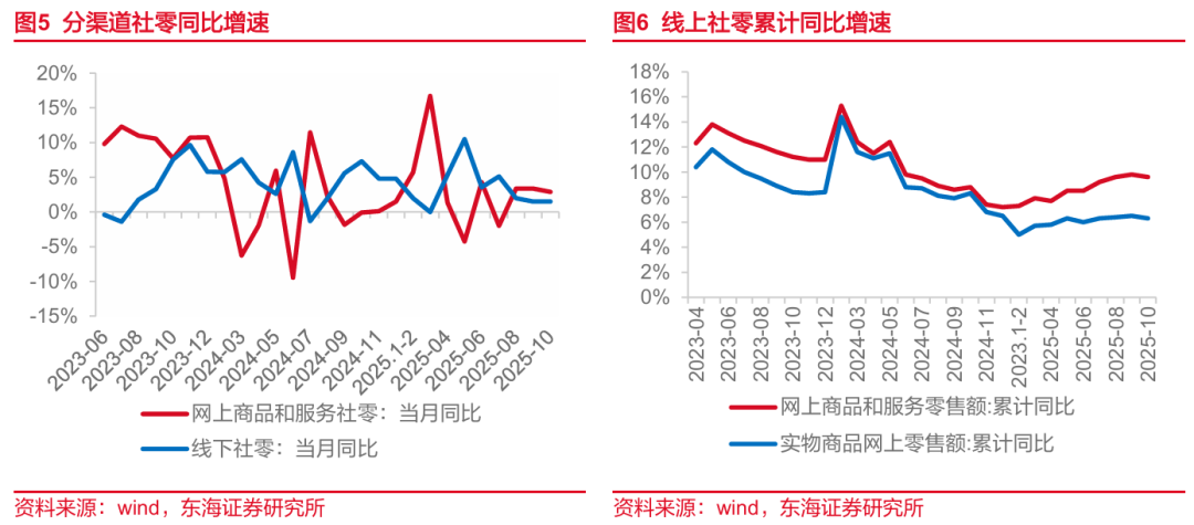 10月当月同比增长2.9%。2025年10月社会消费品零售总额46291亿元,同比增长2.9%,高于wind一致预期(+2.7%)。1)分地域:新型城镇化和乡村全面振兴协同发展,推动县域商业设施日益完善,县乡市场潜力逐步释放。1>城镇:10月消费品零售额40021亿元,同比增长2.7%,增速较上月环比降低0.2个百分点。2>乡村:10月假日经济效应凸显,“乡村游”“古镇游”持续升温,乡村消费品零售额6270亿元,同比增速为4.1%,增速较上月环比提升0.1个百分点。2)分渠道:线上维持较快增长,实体零售经营稳定。1>10月线上维持较快增长。1-10月,网上商品和服务零售额和实物商品网上零售额累计分别同比增长9.6%和6.3%,增速较上月环比-0.2和-0.2pct。从当月值来看,网上商品和服务同比+2.90%,环比-0.49pct。分品类来看,10月网上零售额吃、穿、用分别累计同比增长15.1%、3.6%、5.1%,较上月增速环比持平、+0.8pct、-0.6pct。2>实体零售经营平稳。根据社零、网上商品及服务零售额推算,9月线下社零同比增长1.5%,较上月增速环比持平。