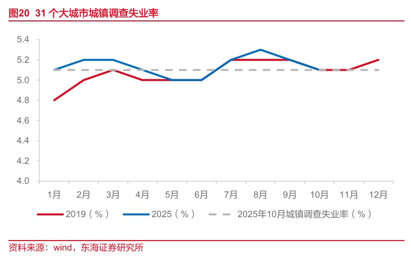 (2)大城市失业率环比下降。2025年10月,全国31个大城市城镇调查失业率5.1%,较上月环比-0.1pct,与城镇调查失业率相同;对比2019年同期持平。