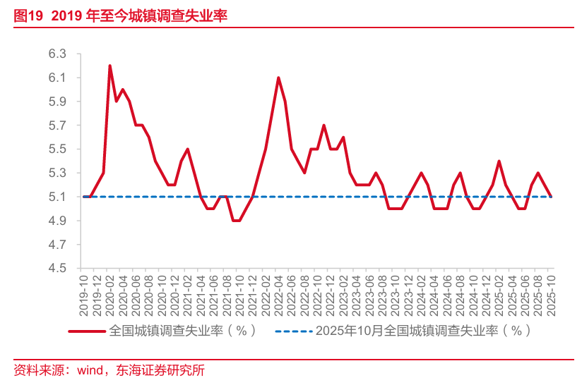 (1)整体情况:失业率环比下降。失业率:2025年10月全国城镇调查失业率5.1%,环比-0.1pct,与2019年同期相比持平。