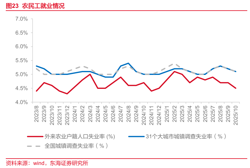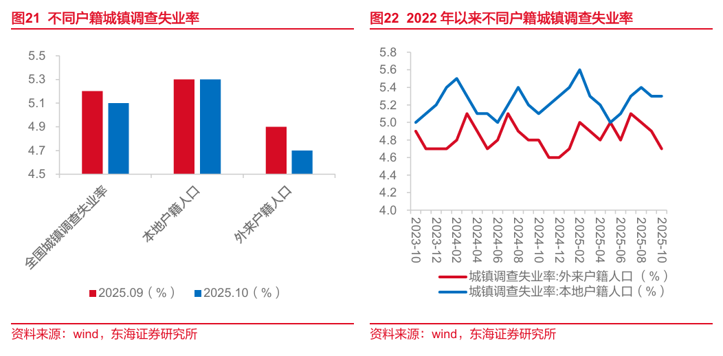 (3)按户籍结构:外来户籍劳动力失业率低于本地户籍。1>外来户籍失业率环比下降,本地户籍环比持平。2025年10月外来户籍人口失业率为4.7%,与上月环比-0.2pct,与去年同期相比下降0.1pct。本地户籍失业率为5.3%,与上月环比持平,高于去年同期0.2pct。2>农民工失业率环比下降。2025年10月外来农业户籍人口失业率4.5%,较上月环比下降0.2pct,好于同期全国城镇调查失业率和外来大城市失业率。