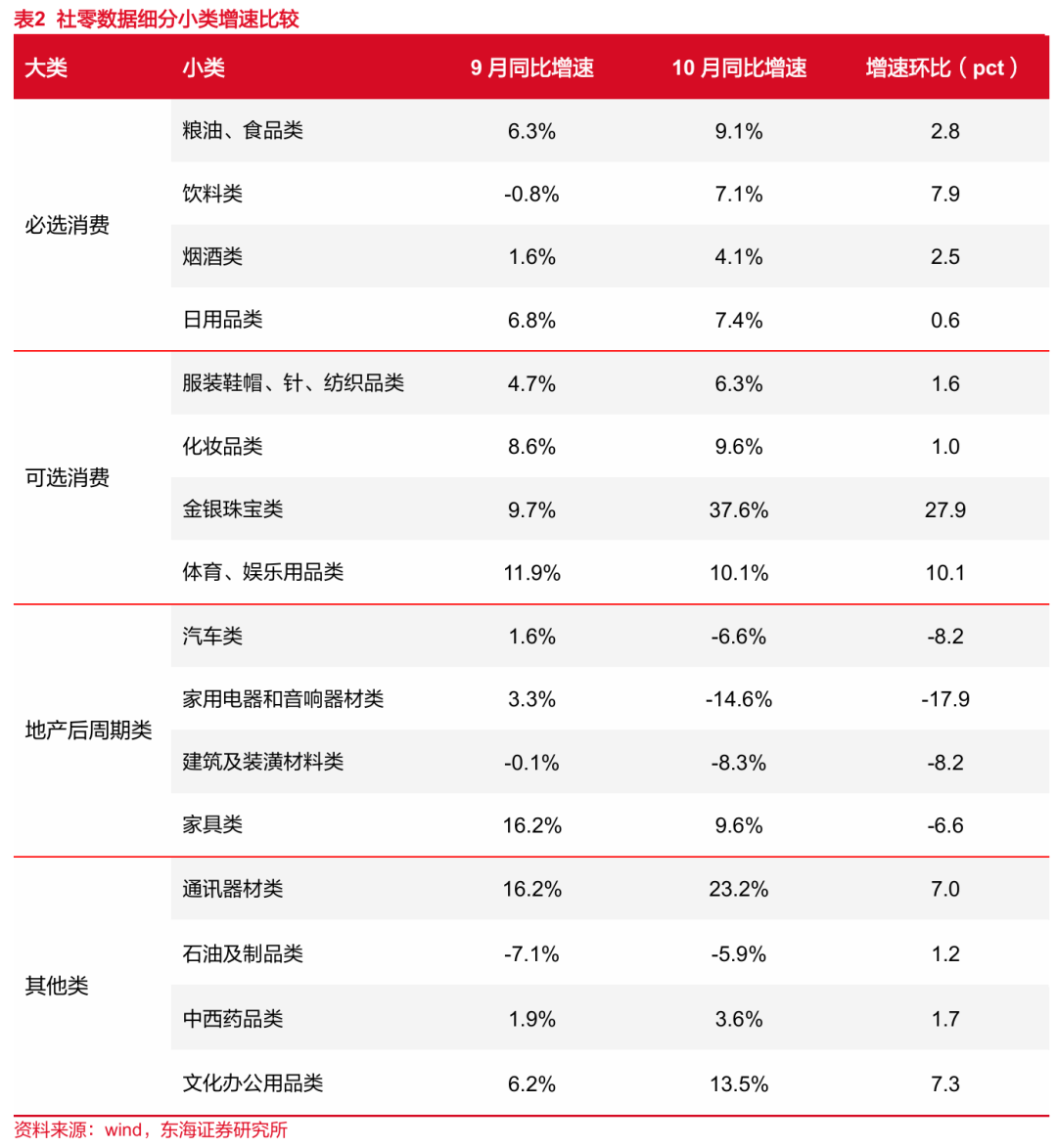 (2)大类表现:可选、必选、其他类边际持续改善,地产后周期同比由正转负。10月必选、可选、地产后周期、其他类零售额同比分别为+7.85%、+10.91%、-7.61%、+4.31%,增速分别较上月环比+2.83pct、+4.37pct、-9.80pct、+4.20pct。