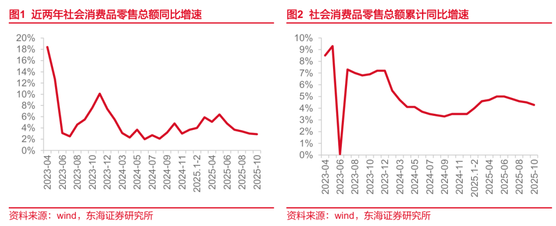 (1)总体情况:10月当月同比增长2.9%。2025年10月社会消费品零售总额46291亿元,同比增长2.9%,高于wind一致预期(+2.7%)。