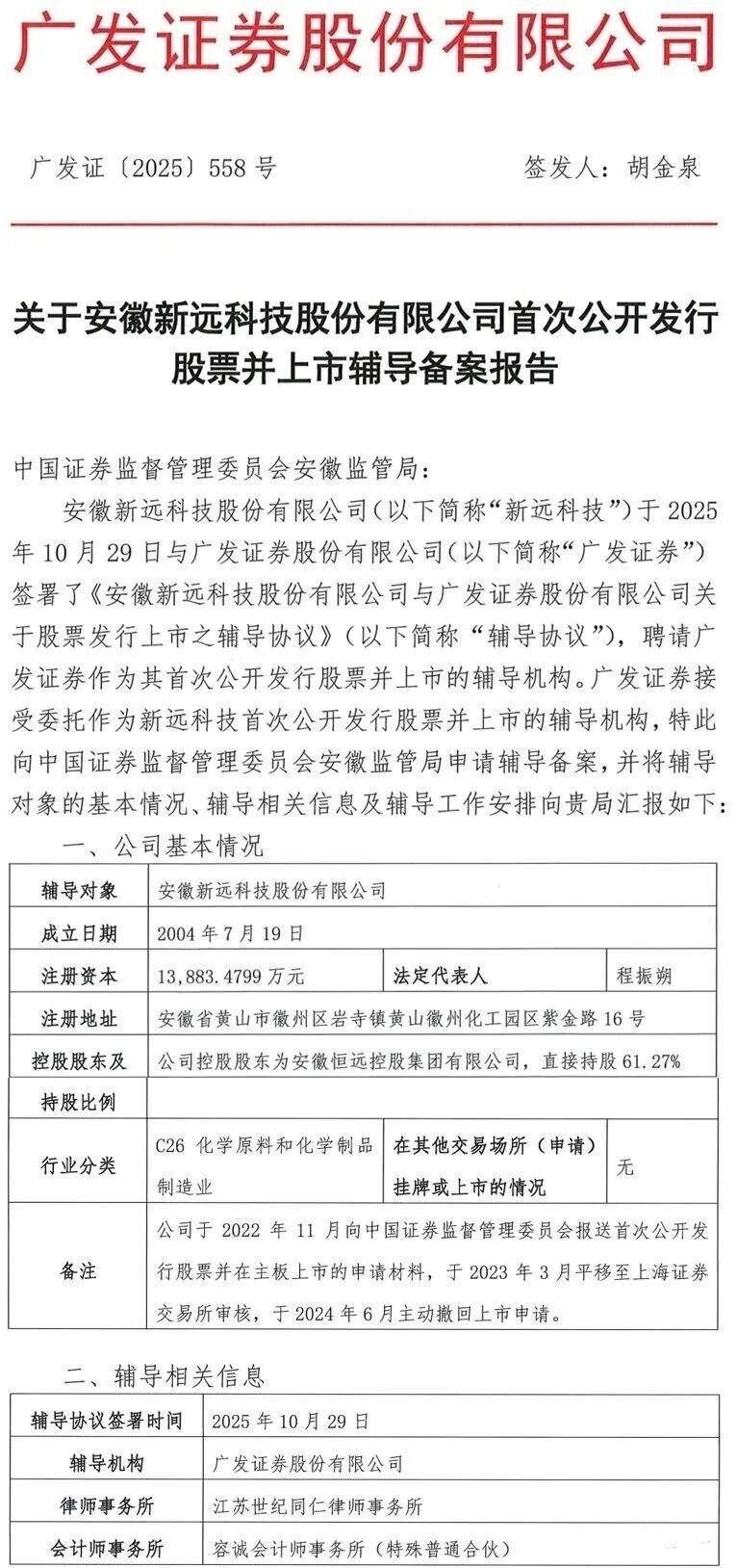 慧正资讯,10月29日,安徽新远科技股份有限公司与广发证券签署上市辅导协议,标志着这家国家级专精特新“小巨人”企业重启IPO进程。这已是新远科技第二次向资本市场发起冲击。早在2022年11月,公司便向证监会报送了主板IPO申请材料,并于2023年3月平移至上交所审核。