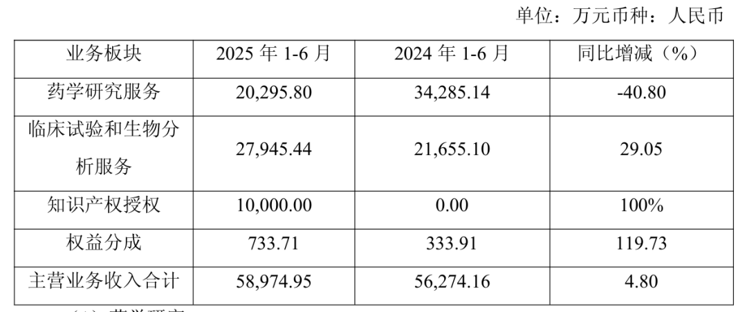 2025年前三季度公司营收8.56 亿元,同比下降 6.65%;扣非归母净利润为1.54 亿元,同比下降 23.89%。业绩下滑结合2025年公司中报来看,有一个更详细的拆分:主要是药学研究服务收入大幅下降带来的,而2025年除了过往的临床前、临床两大板块外,可以看到公司有对外授权的收入和授权出去后的产品商业化放量带来的权益分成。