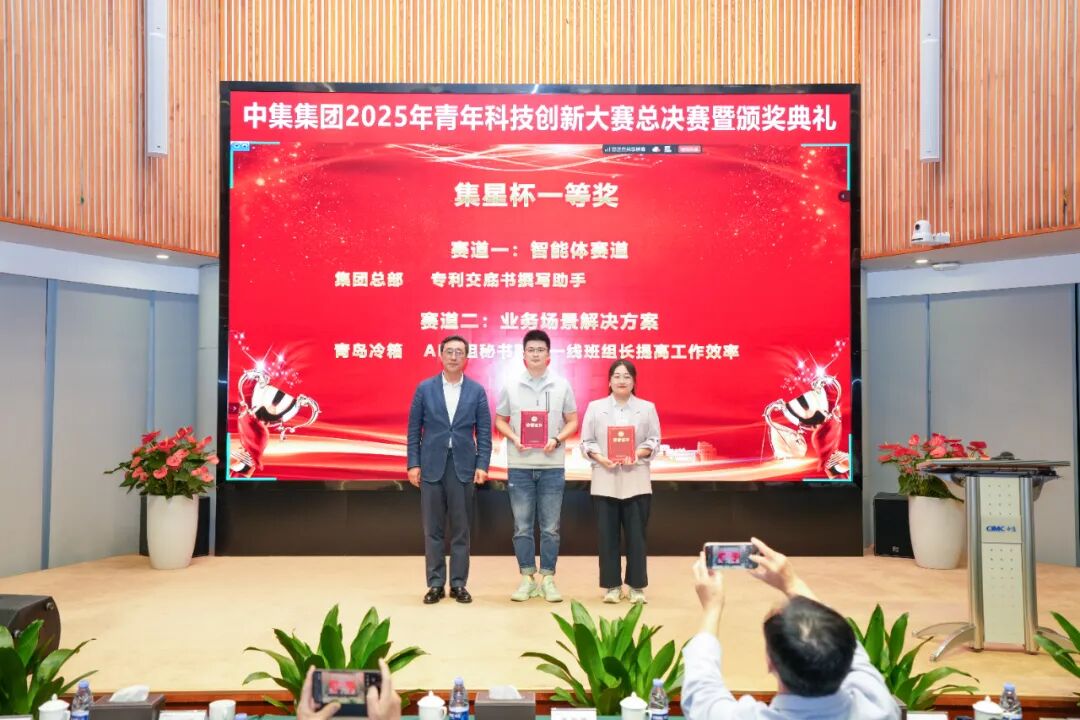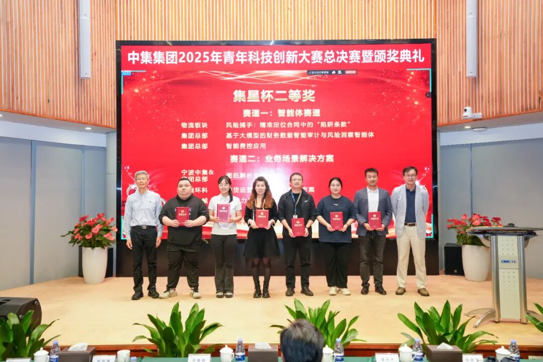 中集集团副总裁李胤辉、集团技术中心主任刘春峰、集团CIO潘进杰、集团办(党委办)主任马天飞现场为获奖团队颁奖。
