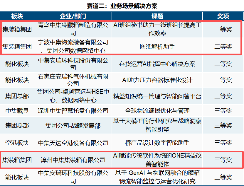 本次大赛面向集团全体员工,以“赛训结合”的模式,鼓励员工围绕真实场景开展AI探索。大赛设置“智能体应用”与“业务场景解决方案”两个赛道,覆盖生产制造、研发设计、供应链、客户营销、财务审计及日常运营等全业务环节,共吸引52家子公司超1300余员工参与,组建205个课题团队。经过多轮评审,56个优秀课题进入决赛,最终20项高价值AI潜力应用获得表彰。其中,中集集装箱集团就有7项AI应用获得表彰。