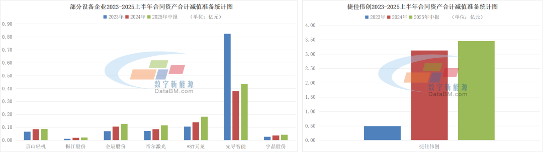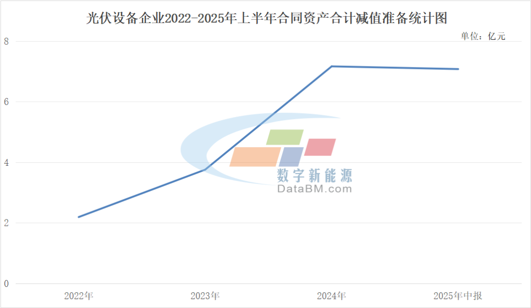 根据数字新能源DataBM.com统计,截至 2025 年上半年,统计范围内的光伏设备企业合同资产合计减值准备达 7.08 亿元,同比增长 92.74%,已接近 2024年全年水平(注:2024年统计范围内的设备企业全年合同资产合计减值为 7.17亿元)。