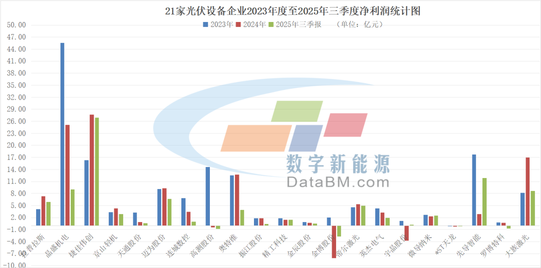 数字新能源DataBM.com统计了 21 家光伏设备企业的今年三季度的业绩。相比主产业链企业,设备企业的业绩好看很多,整体依旧维持盈利,仅有 4 家企业出现亏损。