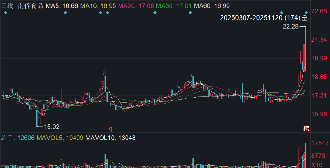 二级市场上,截至11月20日收盘,南侨食品大跌9.37%报19.05元/股,总市值约80.83亿元。记者注意到,该公司股价在近两个交易日内经历了“剧烈波动”,昨日刚刚触及涨停板。
