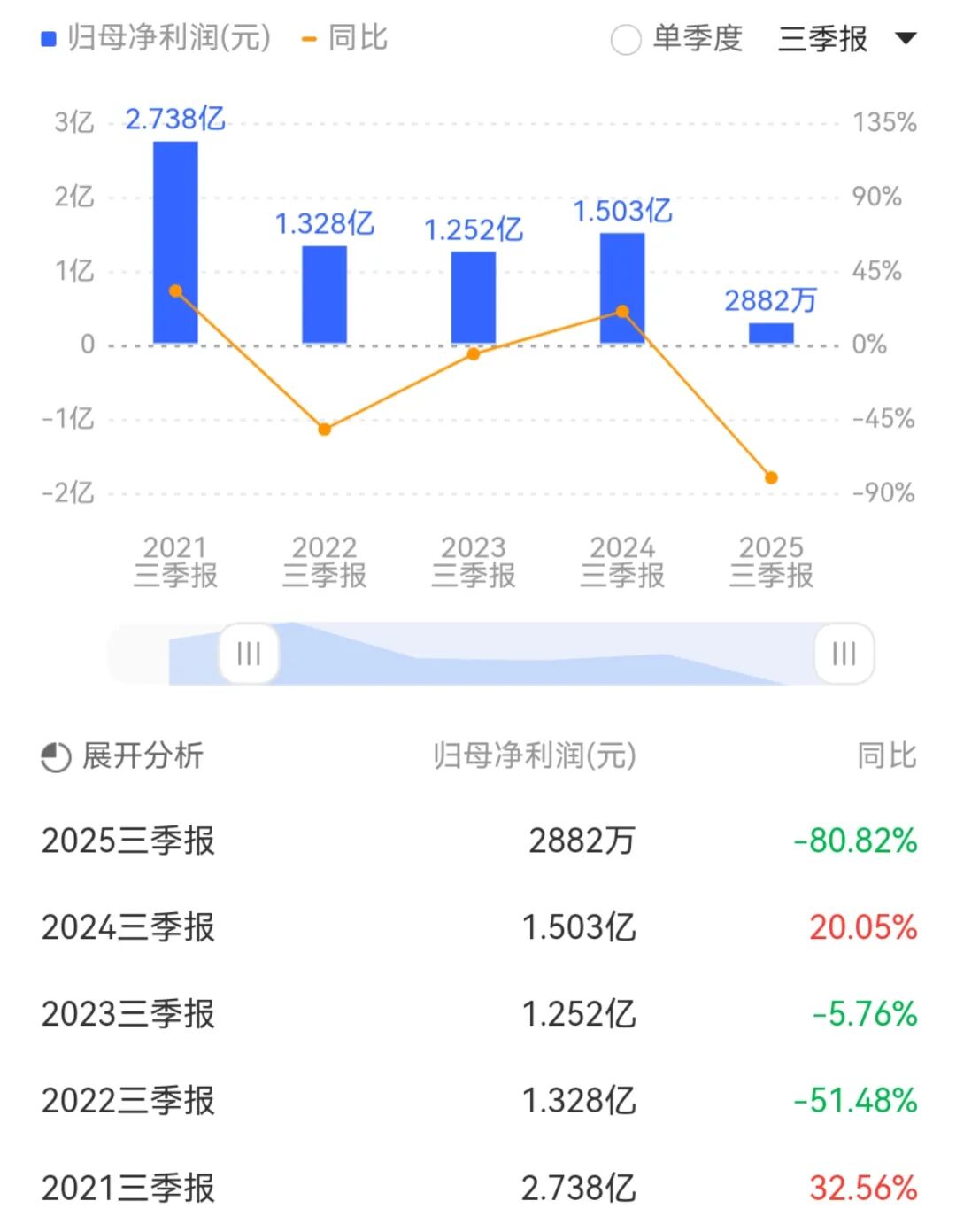 2025年前三季度,公司营业收入为22.68亿元,同比下降1.6%;归母净利润为2882万元,同比下降80.82%,去年同期为1.5亿元;扣非归母净利润为2558万元,同比下降81.69%。