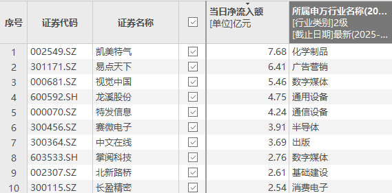上证报中国证券网讯(记者 费天元)Choice数据显示,11月21日,当日资金净流入额排名前十的个股依次是凯美特气、易点天下、视觉中国、龙溪股份、特发信息、赛微电子、中文在线、掌阅科技、北新路桥、长盈精密,净流入额在2.54亿元至7.68亿元不等。其中,易点天下、视觉中国、中文在线等均属于传媒板块。