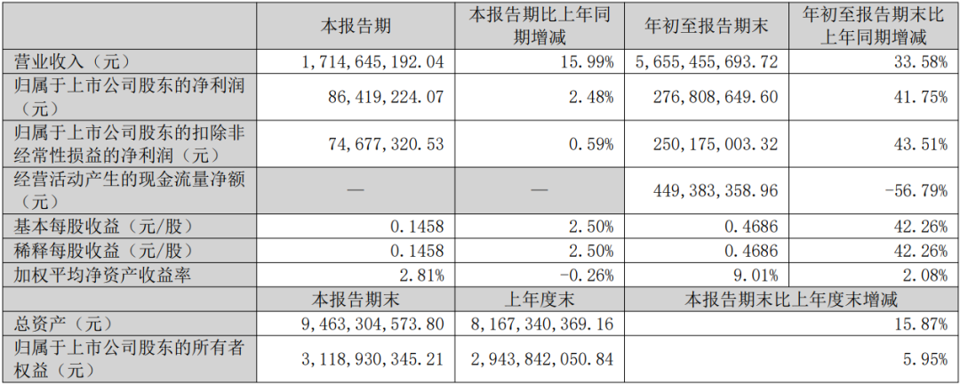 2025年三季度,中通客车实现营业收入17.15亿元,同比增长15.99%。归属于上市公司股东的净利润0.86亿元,同比增长2.48%。扣除非经常性损益的净利润0.75亿元,同比增长0.59%。前三季度累计营业收入56.55亿元,同比增长33.58%。归属上市公司股东的净利润2.77亿元,同比增长41.75%。扣除非经常性损益的净利润2.50亿元,同比增长43.51%。截至2025年9月底,公司总资产达到94.63亿元,与2024年末相比增长15.87%。财务指标方面,2025年前三季度基本每股收益0.4686元,同比增长42.26%。