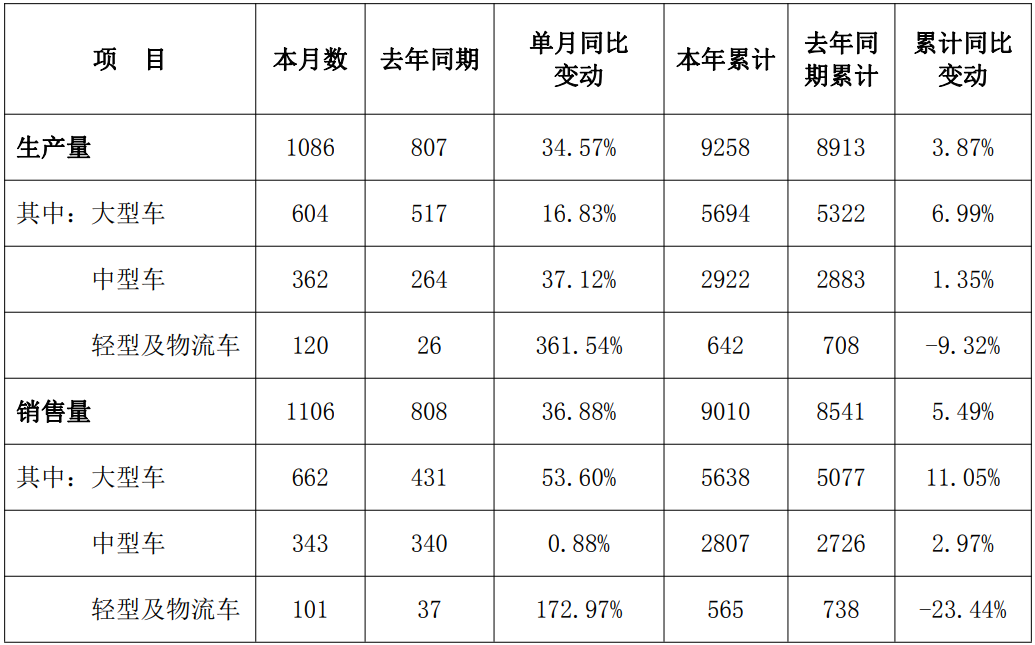2025年1-9月,宇通客车共生产各类客车33874辆,同比增长6.10%,实现销售33556辆,同比增长7.05%。(参考9月份产销快报)