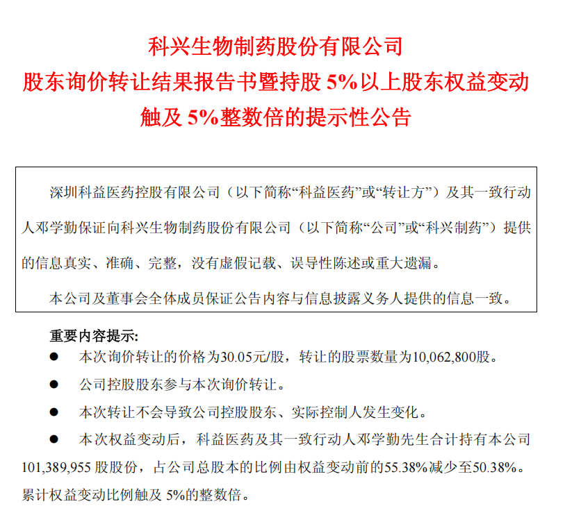 11月20日,科兴制药(688136.SH)披露重磅公告,公司控股股东深圳科益医药控股有限公司(下称“科益医药”)通过询价转让方式完成年内第五轮减持,合计出让1006.28万股,占公司总股本的5.00%。本次转让价格为30.05元/股,对应套现金额约3.02亿元。