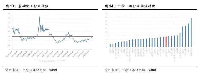 从行业估值情况来看,截止2025年11月20日,中信基础化工板块TTM市盈率(整体法,剔除负值)为28.15倍。2010年以来,行业估值平均水平为29.31倍,目前估值水平略低于历史平均水平。与其他中信一级行业横向对比,基础化工行业估值在30个行业中位居21位,维持行业“同步大市”的投资评级。