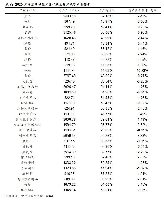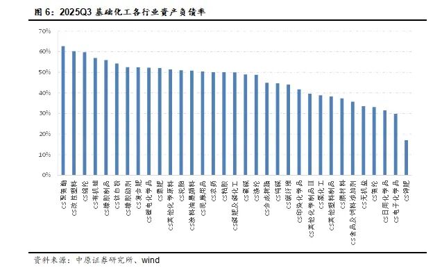 2025年前三季度,基础化工各子行业中,15个子行业资产负债率同比提升,18个子行业同比下降,出现较大分化。其中纯碱、碳纤维、锂电化学品、橡胶制品和氮肥行业资产负债率提升幅度较大,分别提升10.23、4.36、3.33、3.98和2.45个百分点,钾肥、涂料油墨颜料、磷肥及磷酸盐、聚氨酯和合成树脂行业资产负债率下降幅度较大,分别降低3.55、2.45、2.44、2.28和1.87个百分点。