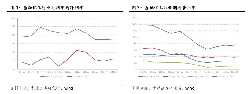 2025年前三季度,中信基础化工行业整体毛利率为17.69%,较2024年前三季度提升0.14个百分点,较2025年中报下滑0.08个百分点,行业盈利能力自2022年以来总体保持稳定,行业景气底部运行。2025年前三季度行业净利率为6.17%,较2024年前三季度提升0.10个百分点,较2025年中报下滑0.04个百分点。前三季度期间费用率7.25%,同比下降0.05个百分点,较2025年中报提升0.03个百分点。总体来看,化工行业盈利能力底部企稳,同比均小幅回升。