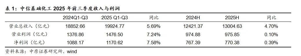 2025前三季度基础化工行业收入利润进一步提升,行业景气延续底部复苏态势。2025年前三季度,中信基础化工行业实现总收入19924.77亿元,同比增长5.69%,实现净利润1170.62亿元,同比增长7.58%。前三季度基础化工行业收入,利润均均保持回升态势。与中报业绩相比,三季报增长幅度明显提升。2025年三季度,基础化工行业的收入、利润同比快速增长,环比继续改善。