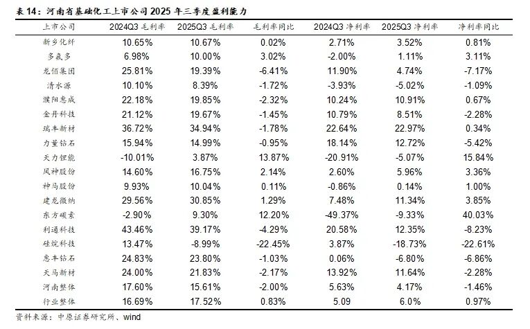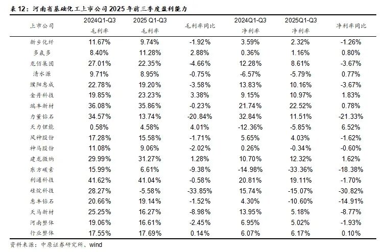 河南省化工企业总体下滑,表现弱于行业水平。2025前三季度与三季度,河南省基础化工上市公司实现营收564.21、188.98亿元,同比下滑2.21%、1.03%;净利润28.32、7.88亿元,下滑29.33%、26.70%;毛利率分别为16.61%和15.61%,净利率分别为5.02%和4.17%,整体均呈下滑态势,表现弱于行业水平。