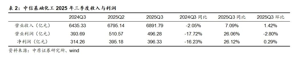 2025年第三季度,中信基础化工行业实现营业收入6891.19亿元,同比增长7.09%,环比增长1.42%;实现营业利润496.28亿元,同比增长26.06%,环比下滑2.80%;实现归属上市公司股东的净利润396.33亿元,同比增长26.12%,环比增长0.29%。三季度,基础化工行业的收入、利润同比实现交流增长,环比继续改善,行业景气保持底部复苏态势。
